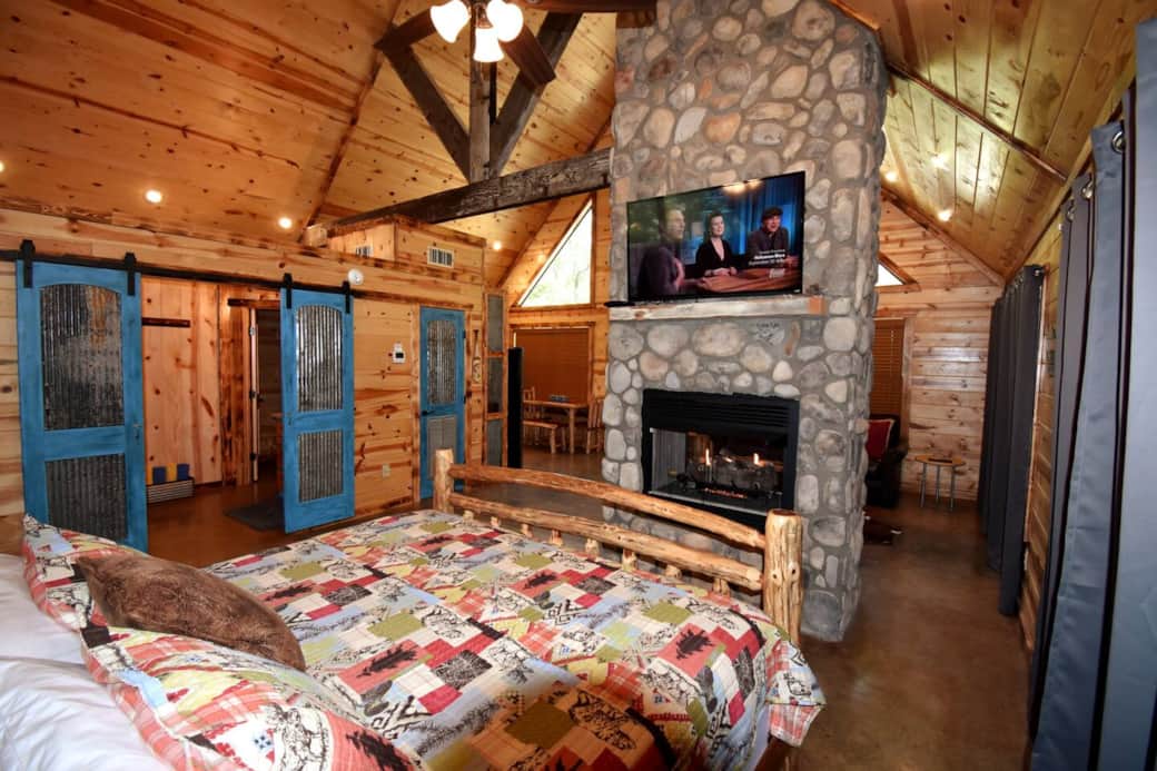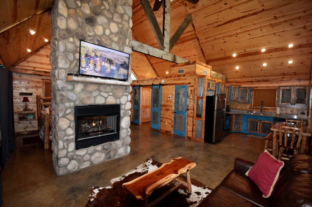 The living and bedroom areas are separated by a see-through gas log fireplace with river rock pinning from floor to ceiling. The bedroom has a king size cedar log bed and the bathroom entrance has sliding barn doors and that open to a walk-in shower. The kitchen is furnished with stainless steel appliances, granite counter tops and is fully stocked with the essentials you need to cook!